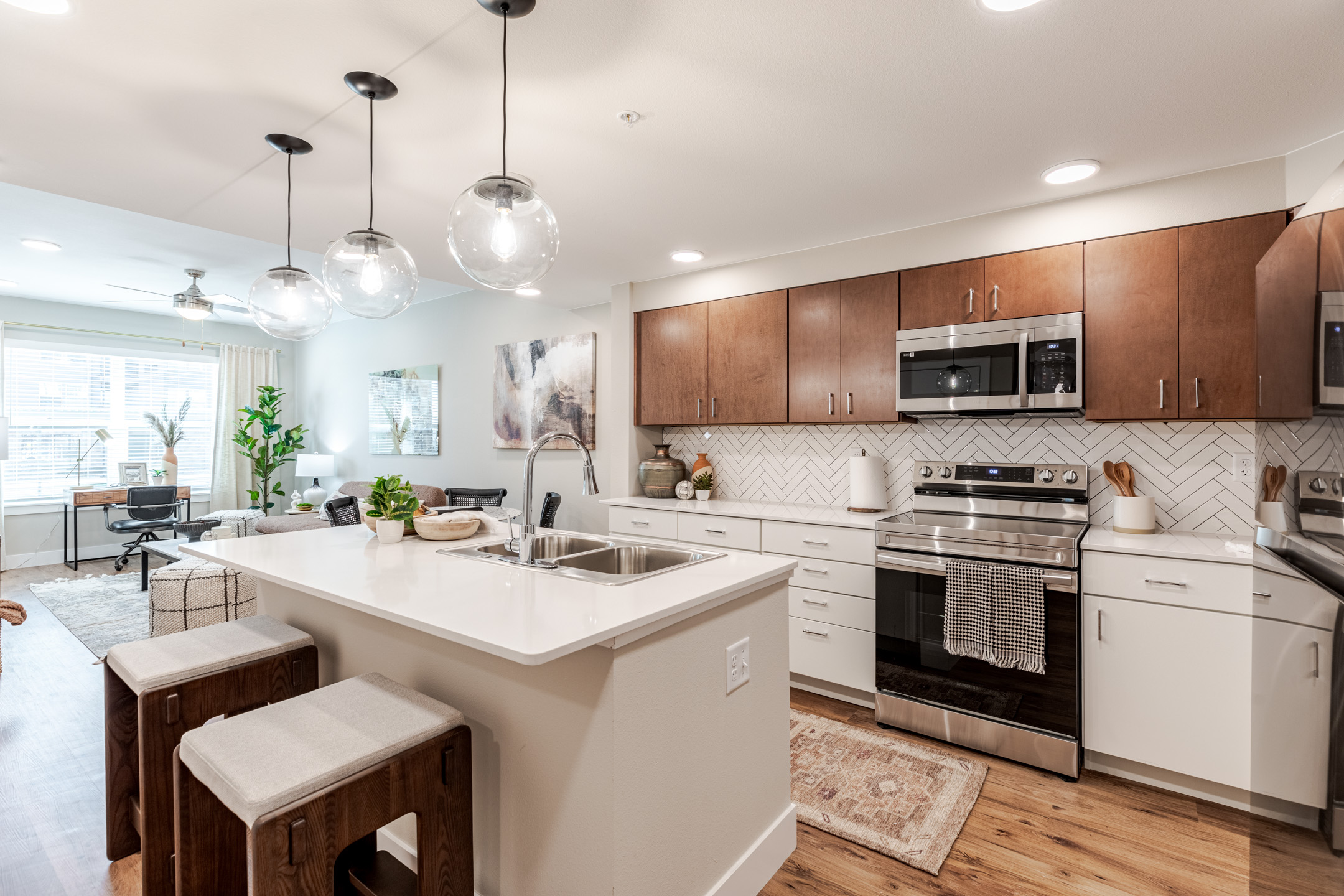 Step into a world of refined comfort in our brand-new apartments and townhomes that feature stainless steel appliances, quartz countertops, and sleek hardwood-style flooring that sets the stage for a stylish lifestyle. Looking for even more space? Explore our 1 bedroom townhomes with a one-car garage. Elevate your daily experience with community amenities crafted to perfection, including a state-of-the-art clubhouse, a resort-style pool, a convenient parcel hub, and much more. We extend our commitment to your well-being with thoughtful touches such as bike storage for your active lifestyle.