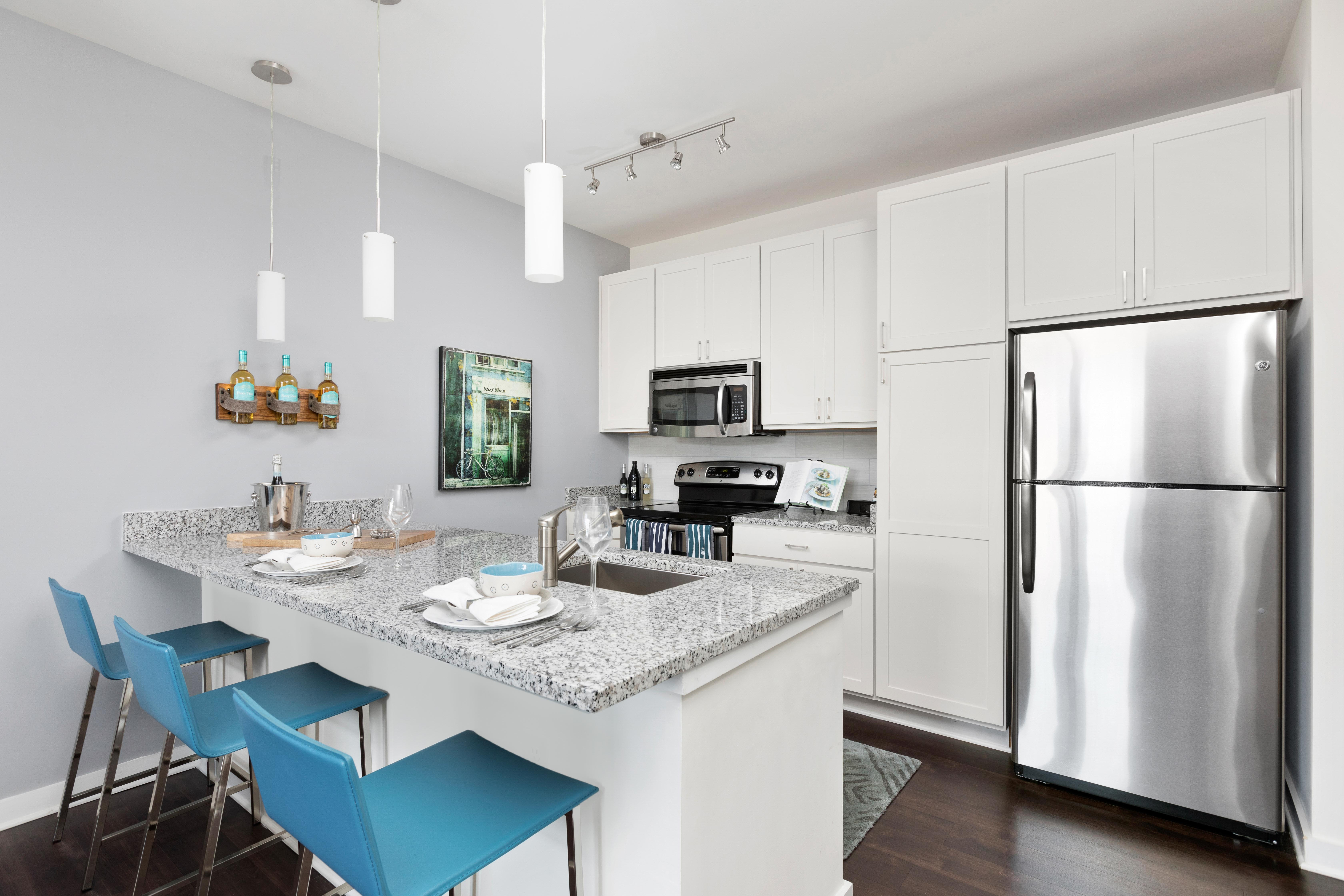 Give yourself a self-guided tour of your future home! Check out our comprehensive photo gallery with images of our indulgent features and amenities. View our gorgeous hardwood-style flooring, spacious kitchen with tile backsplash, granite countertops and stainless steel appliances, in-home washer and dryer, comfy bedrooms with roomy walk-in closets, and more. Browse our amenities, including the amazing resort-style pool with lounge chairs, cabanas, and a fire pit, the 24-hour fitness center with free weights, cardio equipment, and virtual fitness classes, or the clubhouse with a demonstration kitchen and billiards room. Contact us today for more information about our community!